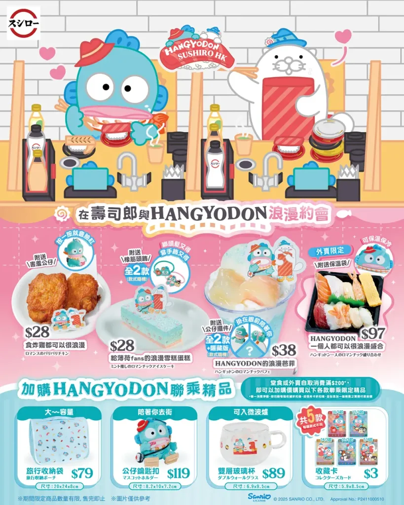 由3月10日起至4月11日,壽司郎四間指定分店將搖身一變成為HANGYODON聯乘特別主題店,包括旺角店、樂富店、上環店及荃灣廣場店,並設置多個特色打卡位供粉絲朝聖。推廣期內全線分店更推出三款聯乘商品及一款外賣盛合,並隨餐附送限量獨家周邊精品(款式隨機),另外凡堂食或外賣自取消費滿指定金額更可加購香港限定別注周邊,絕對是粉絲珍藏必收。